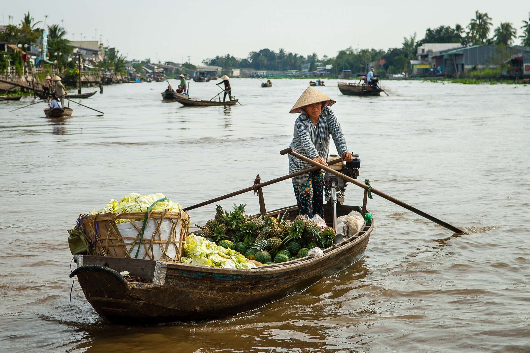 Auf den schwimmenden Märkten kann man alles was im Mekongdelta angebaut und geerntet wird kaufen. Die Kähne und Boote sind bis zum Anschlag beladen. Neben köstlichen Tropenfrüchte wie Mango, Ananas oder Bananen, findet man aber auch Gemüse, fangfrischen Fisch, Reis oder Kokosnüsse.
