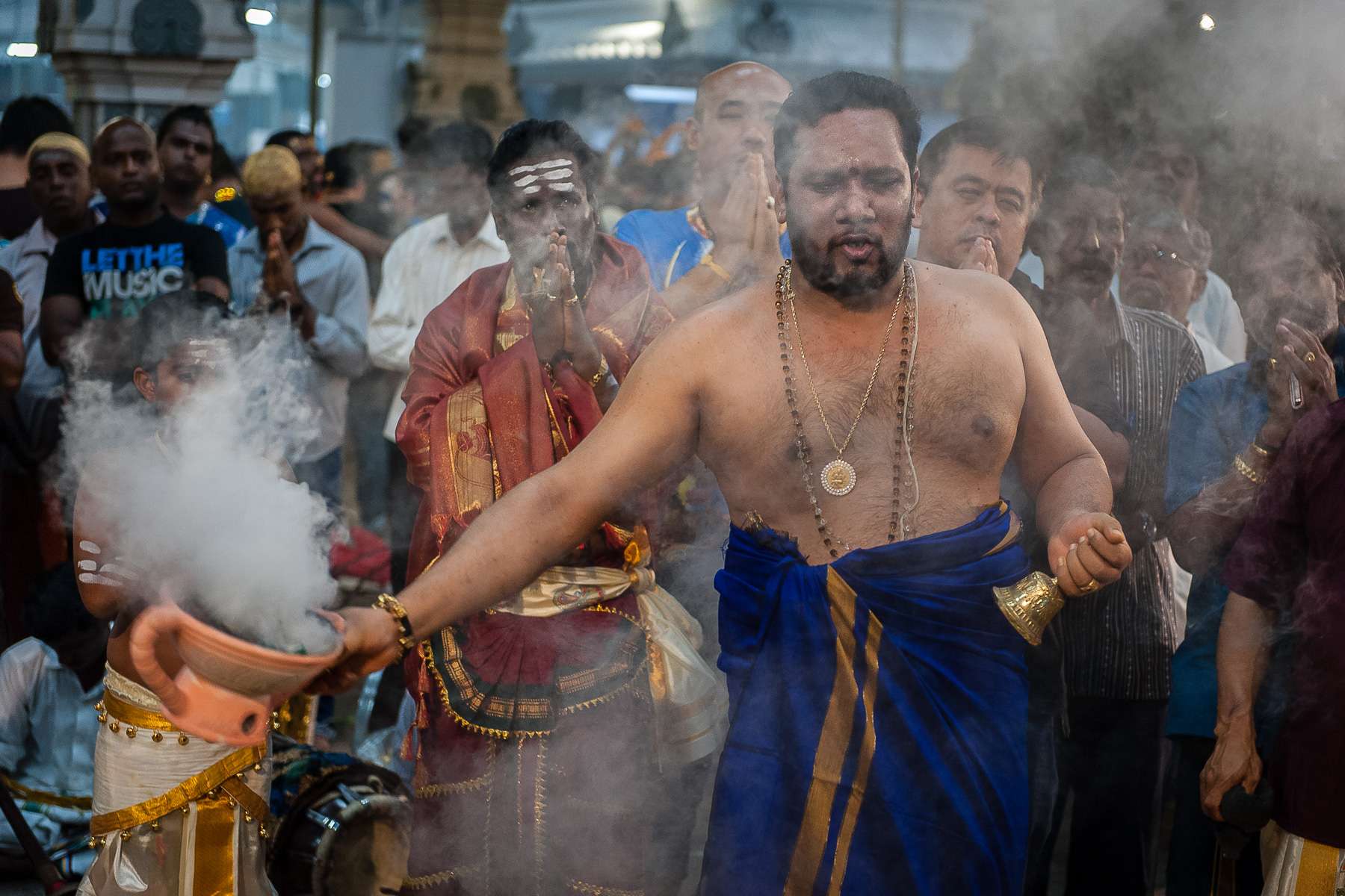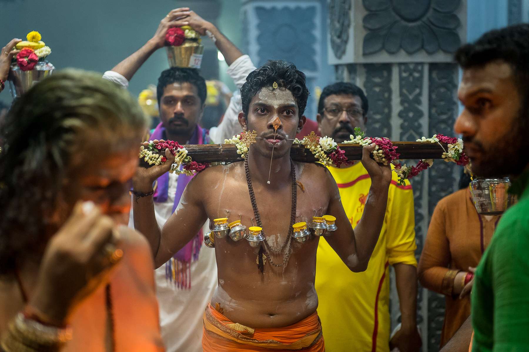 Das Fest erstreckt sich normalerweise über zwei Tage. In Singapur ziehen die Teilnehmer vom Sri Thendayuthapani Tempel zum Layan Sithi Vinayagar Tempel. Die Prozession beginnt um Mitternacht. Während der gesamten Nacht und des gesamten Tages zieht eine Gruppe von gläubigen Menschen in mondgelben Gewändern schweigend durch die abgesperrten Straßen zum Tempel. Diejenigen, die sich nicht mit Haken und Spießen kasteit, tragen silberne Töpfe mit Milch als Opfergabe für die Götter auf ihren Köpfen. Vor dem Marsch gleicht der Sri Thendayuthapani Tempel einem riesigen Piercingstudio. Ich habe die Bilder im Jahr 2013 und 2017 jeweils von 22 Uhr bis 4 Uhr morgens im Sri Thendayuthapani Tempel aufgenommen.